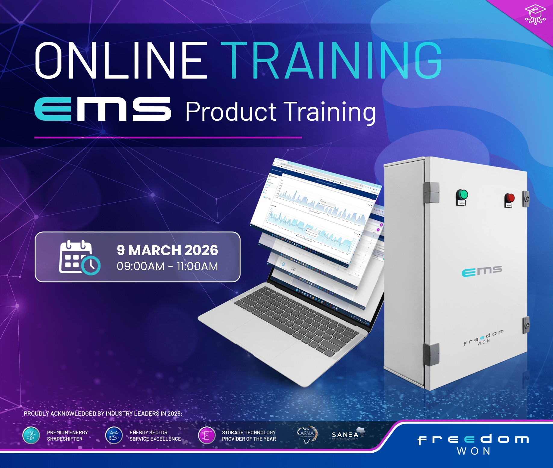 The Freedom Won EMS product training introduces users to our Energy management system. It covers the site management functions, device integration, and management, and showcases real-world user cases that feature the EMS. The Freedom Won EMS product training introduces users to our Energy management system. It covers the site management functions, device integration and management, and showcases real-world user cases that feature the EMS.
