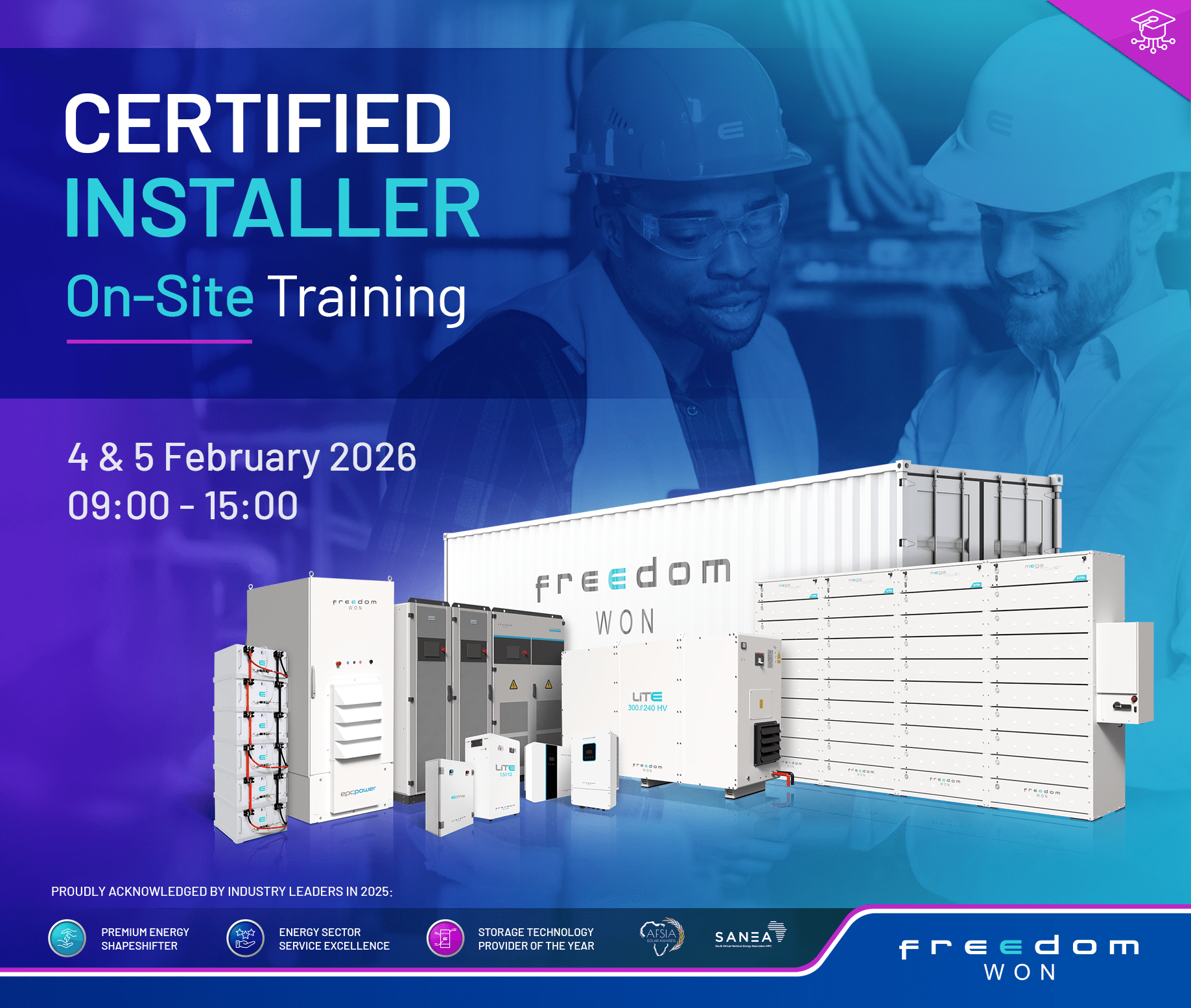 Training Overview: The megaTower Product Training is a training course that covers the safety, design and inverter compatibility of the Freedom Won megaTower Plus and megaTower Extra commercial and industrial […]